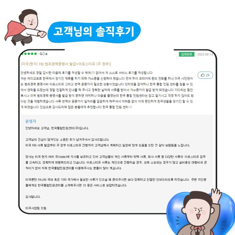 한국 통합 민원센타는 믿고 맡기시고 걱정 하지 않아도 된다는 것을 체험하였습니다.