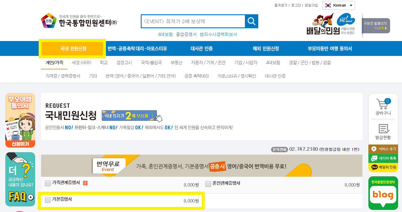 그렇다면 배달의 민원을 통해 기본증명서의 영문 발급을