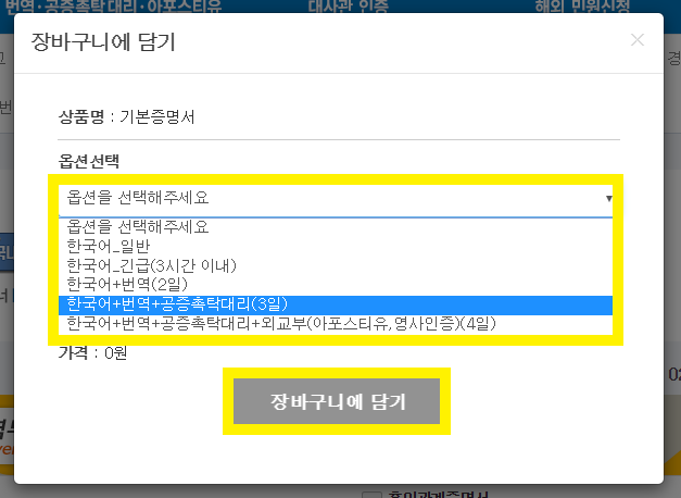 3. 옵션 선택에서 '한국어+번역+공증촉탁대리(3일)'을 선택한 뒤,