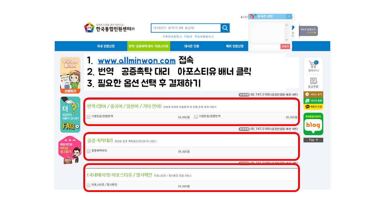 2. 번역, 공증촉탁대리, 아포스티유 배너를 클릭해준다.
