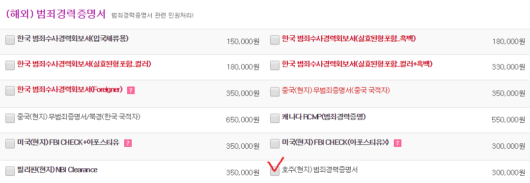 3. 호주(현지) 범죄경력증명서를 클릭한 후 장바구니에 담아 결제합니다.
