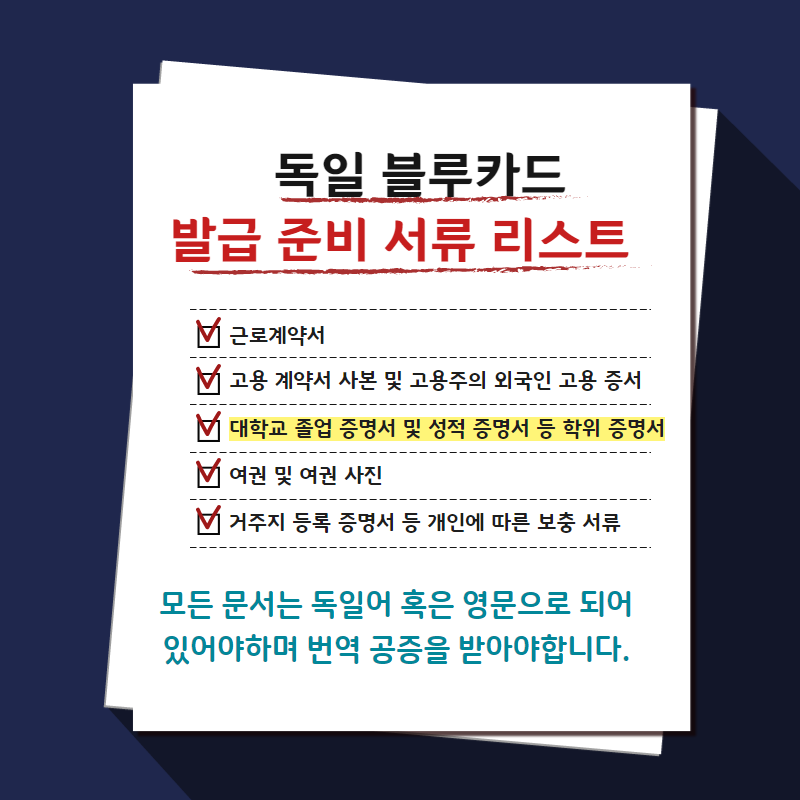 오늘 알려드린 독일 블루카드 발급을 위한 졸업증명서 준비 외에도