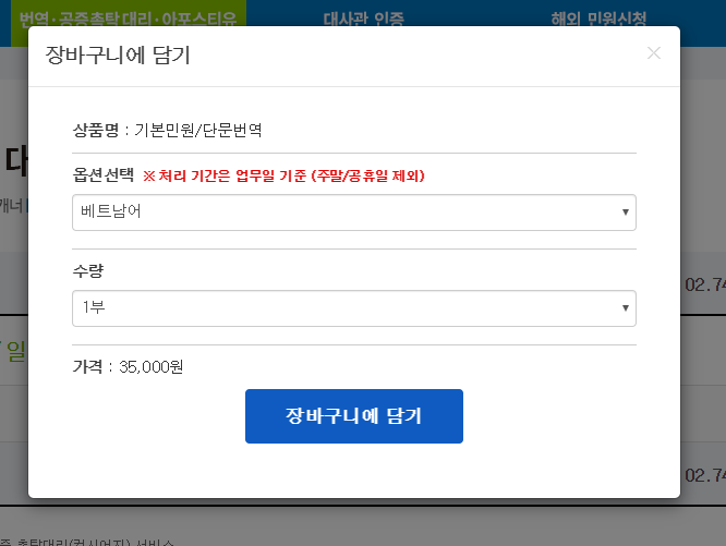 번역 공증 촉탁 대리(기타 언어) 번역비 불포함 옵션을 선택해주시면 완성!