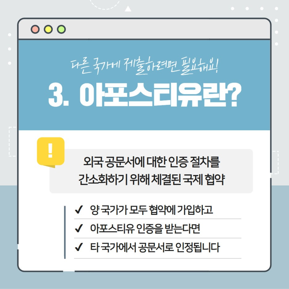 이런 경우에는 아포스티유를 통해 서류의 효력을 인정받아야 합니다.