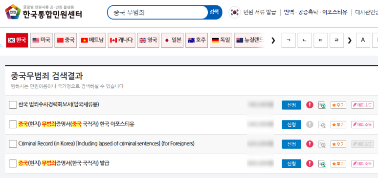 중국에서 발급한 무범죄증명서를 한국에 제출할 때는