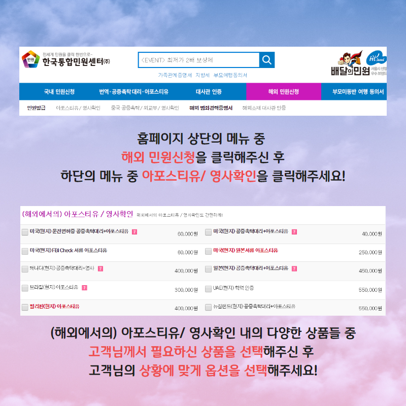 배달의 민원, 전세계 민원서류 발급신청, 번역, 공증촉탁대리, 외교부 아포스티유, 영사확인, 전세계 대사관확인, 해외배송까지 원스톱, 전세계 최초의 글로발 민원 토탈 원스톱 서비스