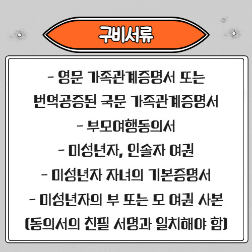 - 만 15세 미만이라면 혼자 입국 불가, 부 또는 모가 아닌 제3자와 입국하는 경우에는 부모여행동의서 필수