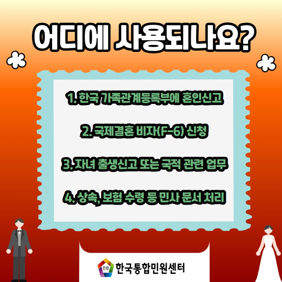 그 밖에도 재혼, 이혼 소송 관련 과거 혼인 증명시에 사용이 됩니다!