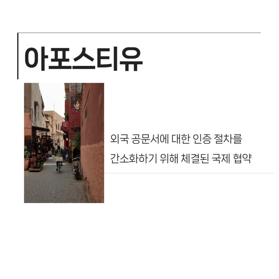 우선 아포스티유란 외국 공문서에 대한 인증 절차를 간소화하기 위해 체결된 국제 협약을 뜻합니다!