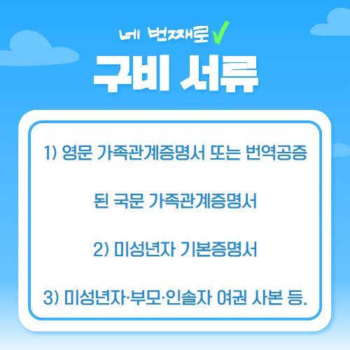 가족(양부모, 한 부모, 이혼가정 등) 상황에 따라 달라지므로, 어떠한 서류가 필요한지 직접 확인해 주셔야 합니다. 예시) 이혼가정이지만 부모 모두 친권을 보유한 경우 - 자녀 기준 영문 가족관계증명서 등