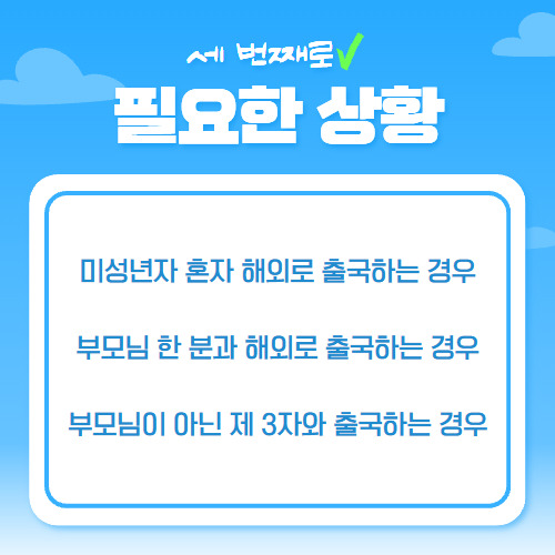 부모여행동의서가 필요한 상황은 어떻게 될까요?! 아이가 법적 보호자 없이 해외로 출국하는 경우에 요구됩니다. 1) 아이 혼자 출국하는 경우 2) 부모가 아닌 제3자와 출국하는 경우 - 할머니 할아버지 이모 삼촌 모두 포함 3) 부모 중 한 명과 출국하는 경우. 이렇게 3가지 상황으로 나뉠 수 있습니다.