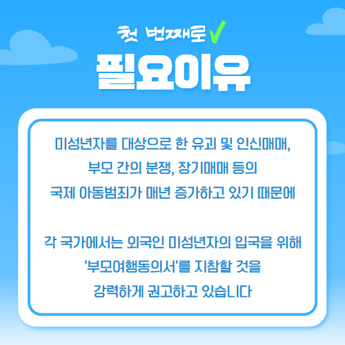 우선 부모여행동의서가 필요한 이유부터 설명을 해드리겠습니다. 최근 미성년자를 대상으로 한 유괴 및 인신매매, 부모 간의 분쟁, 장기매매 등의 국제 아동범죄가 매년 증가하고 있기 때문에 각 국가에서는 외국인 미성년자의 입국을 위해 '부모여행동의서'를 지참할 것을 강력하게 권고하고 있습니다.