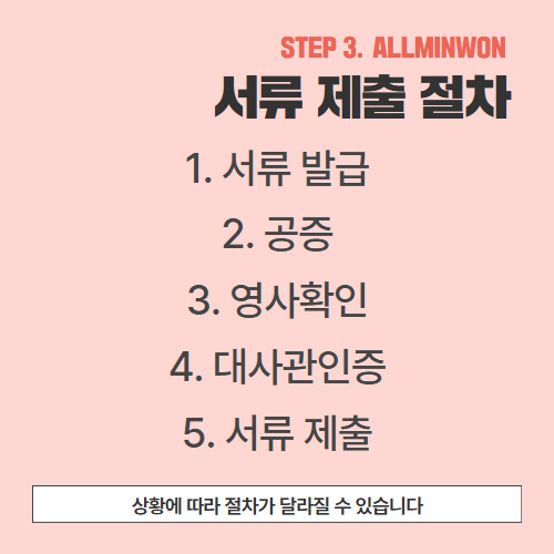 최종적으로 준비한 서류를 제출하기 위해서는 다음과 같이 진행되어야 하는데요. 절차는 크게 5가지로 나뉩니다. 물론 상황에 따라 제출 방법이 상이할 수 있으니 문의는 필수입니다. 1) 서류 발급 2) 공증 3)영사확인 4)대사관인증 5) 서류 제출.