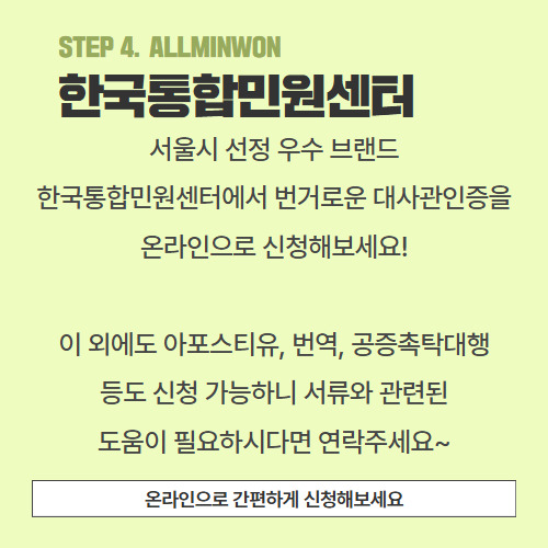 서울시 선정 우수 브랜드 기업, 한국통합민원센터를 통해 태국 현지에서 사용하기 위해 필요한 대사관인증을 온라인으로 신청해 보세요. 여러분들의 시간을 저희가 절약해드릴 테니 온라인으로 간편하게 신청만 해주시면 됩니다.