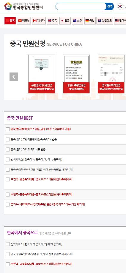 2. 중국배너클릭하고 필요한 서비스 확인 후 신청(아포스티유,공증)