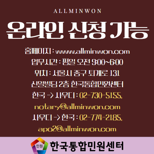 한국 -> 사우디 : 02-730-5155, notary@allminwon.com