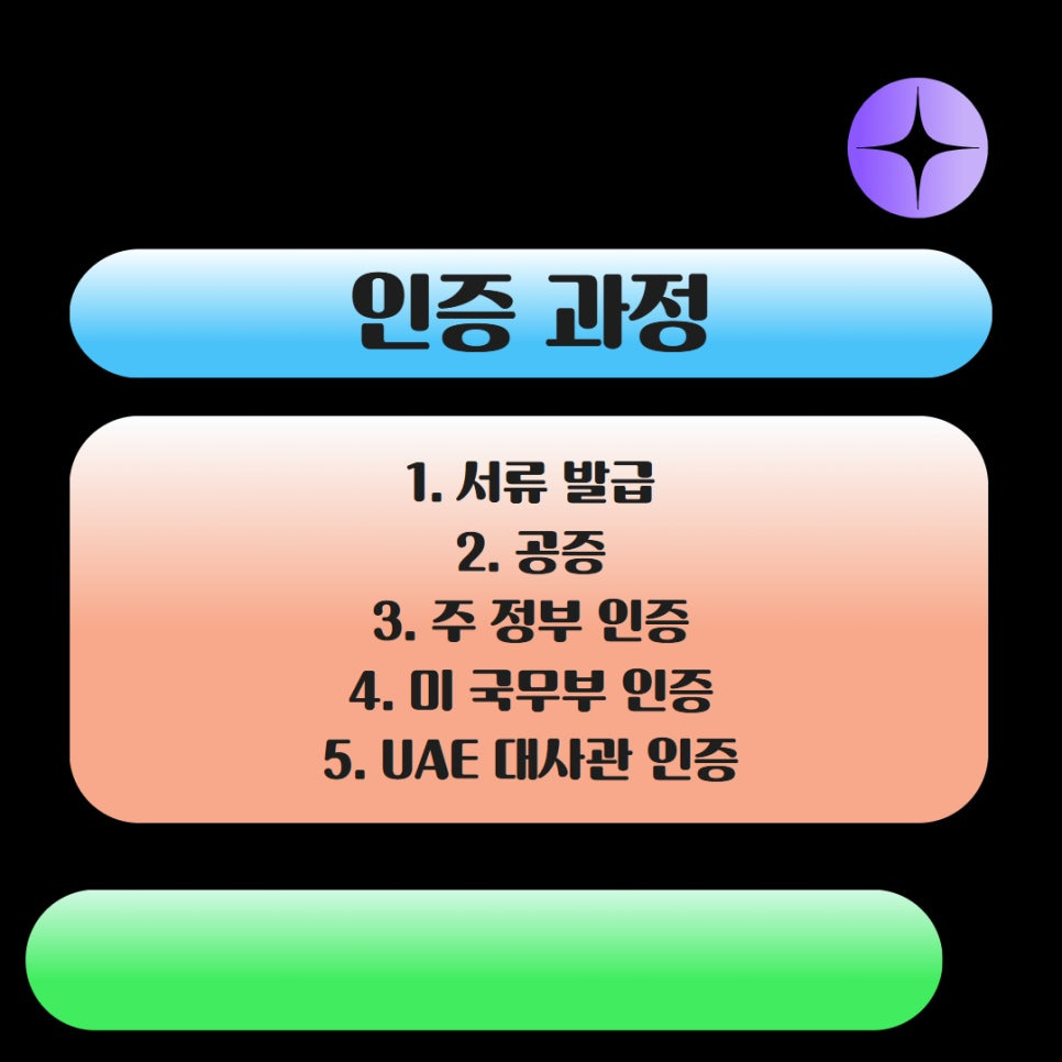 '서류 발급 -> 공증 -> 주 정부 인증 -> 미 국무부 인증 -> UAE 대사관 인증'이라는