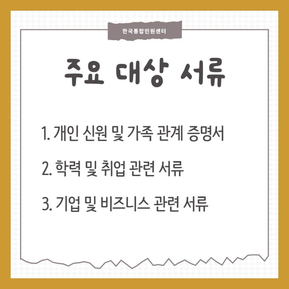 한국통합민원센터에서는 서류 발급부터 번역, 번역공증, 영사확인, 대사관 인증까지