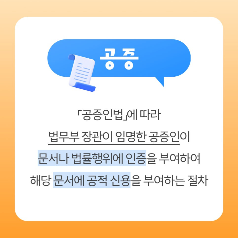 공증이란 「공증인법」에 따라 법무부 장관이 임명한 공증인이 문서나 법률행위에 인증을 부여하여