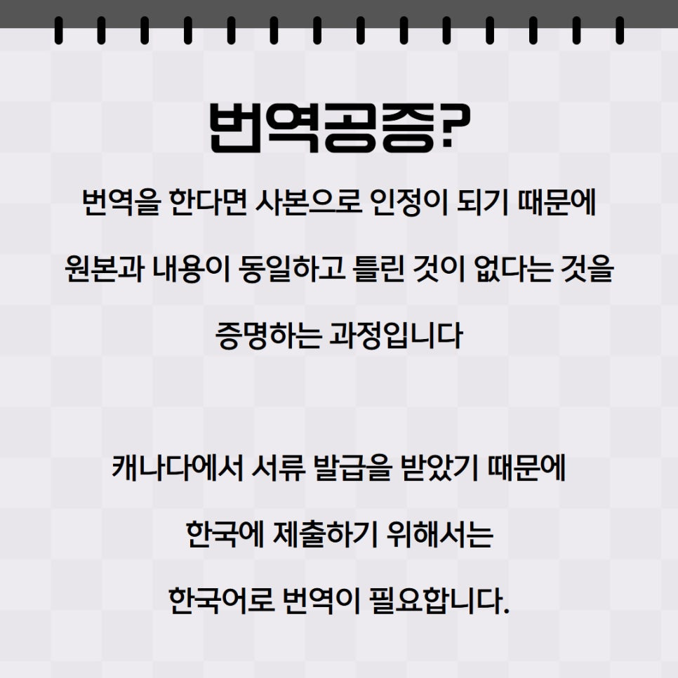 즉, 캐나다에서 받은 서류에 번역을 요구받은 상황이라면 번역공증을 진행해야지만, 제출한 서류가 별 문제없이 사용될 수 있습니다.