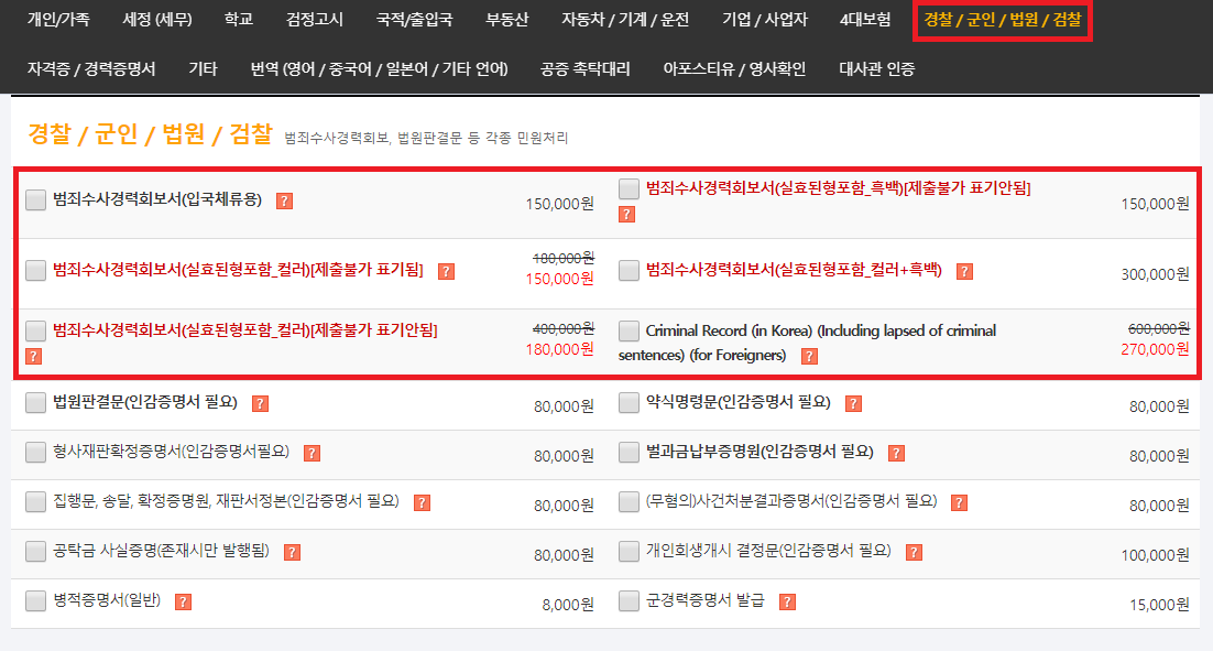 STEP 2. [경찰/군인/법원/검찰]항목에서 [범죄수사경력회보서] 중 원하시는 유형을 선택합니다.