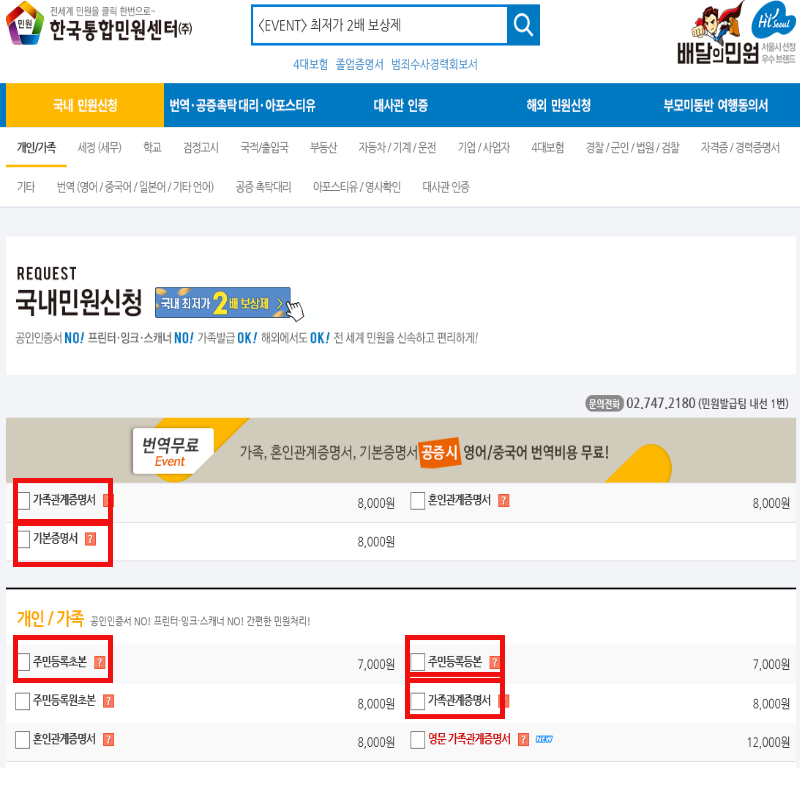 2. 상단 국내민원신청 -> 개인/가족 클릭 후 원하는 민원서류를 장바구니로 !!