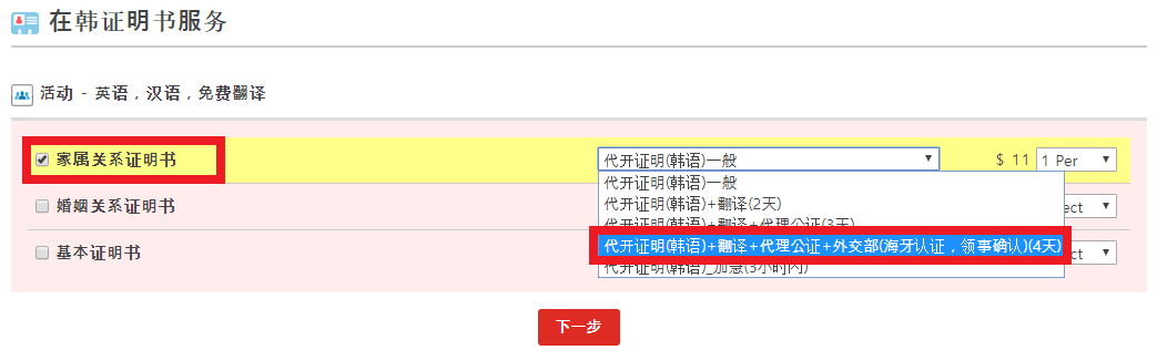 3、点击‘家属关系证明书 - 代开证明(韩语)+翻译+代理公证+外交部(海牙认证,领事确认)(4天)’