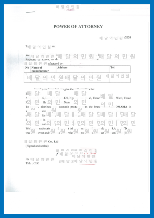 위임장의 경우에는 베트남 내 수입업체가 수입 화장품의 유통권을 인가받기 위해