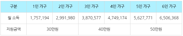 3. 가구원 세전소득액 합산이 아래 표의 금액보다 적은 경우 (중위소득 100% 이하)